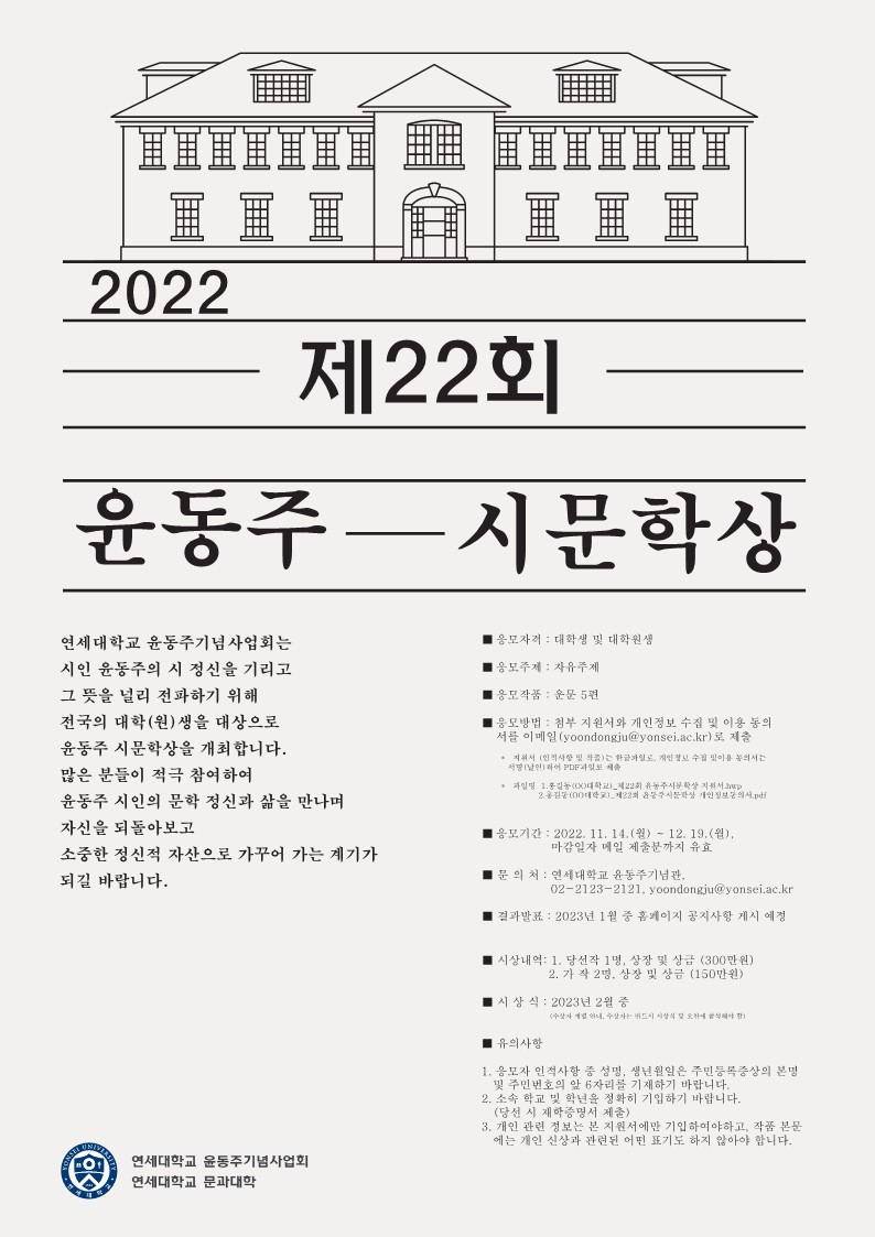 | 제목 | 제22회 윤동주 시문학상 공모 안내 | ||||