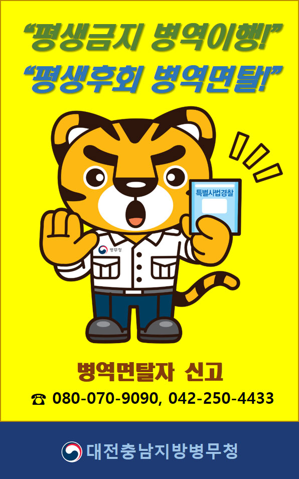 - "평생금지 병역이행!", "평생후회 병역면탈!" - 병역면탈자 신고 080 - 070 - 9090 / 대전충남지방병무청 특사경 ☎042-250-4433
