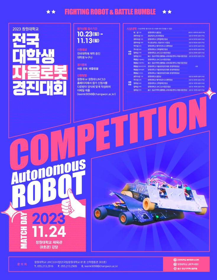 | 제목 | 2023 창원대학교 전국대학생 자율로봇경진대회 모집 안내 | ||||
