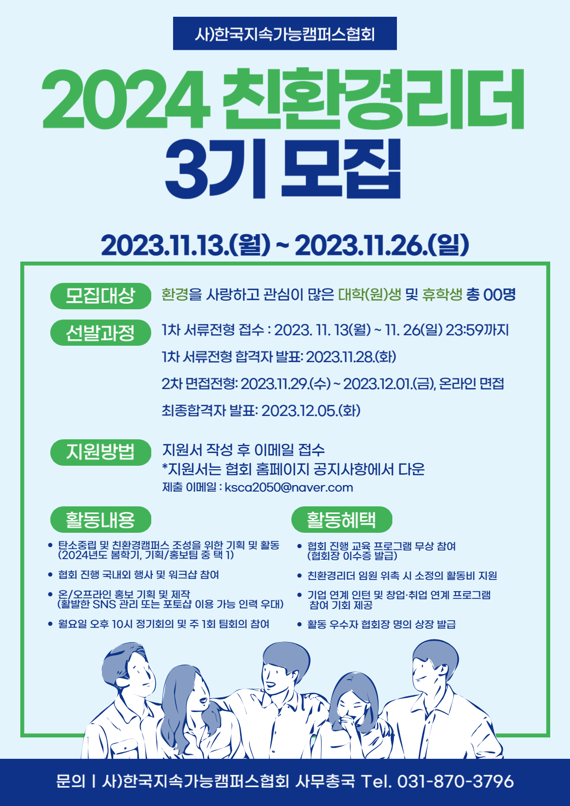 | 제목 | 2024년도 사)한국지속가능캠퍼스협회 대학생「친환경리더」3기 모집 안내 | ||||