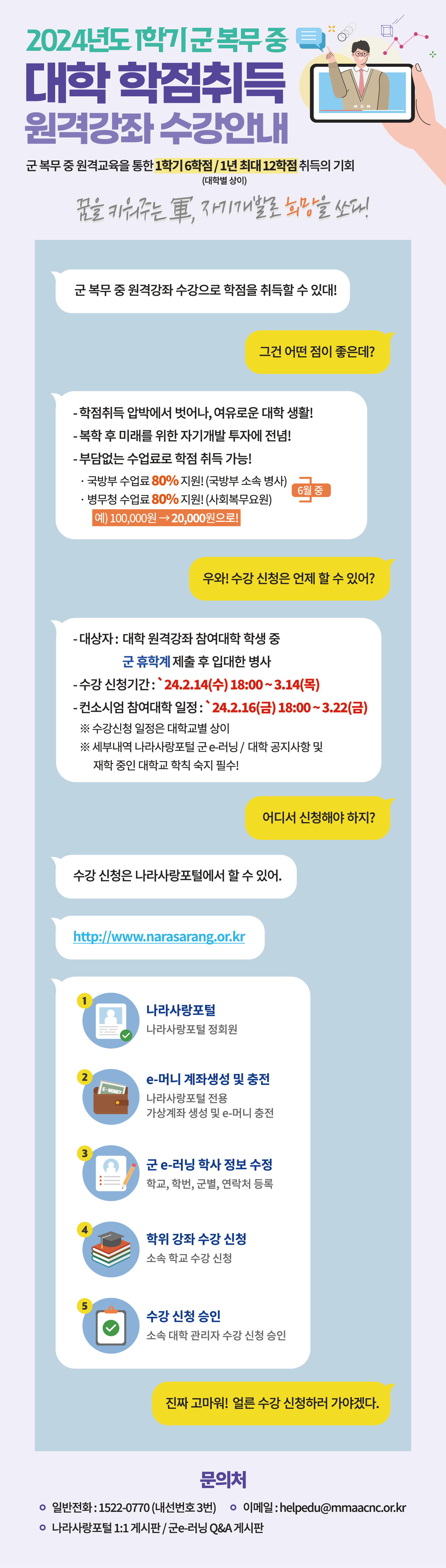 | 제목 | 2024학년도 1학기 군 복무 중 대학 학점취득(군e러닝) 원격강좌 수강 안내 | ||||