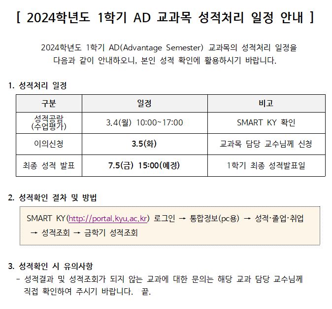 | 제목 | 2024학년도 1학기 AD(Advantage Semester) 교과목 성적처리 일정 안내 | ||||