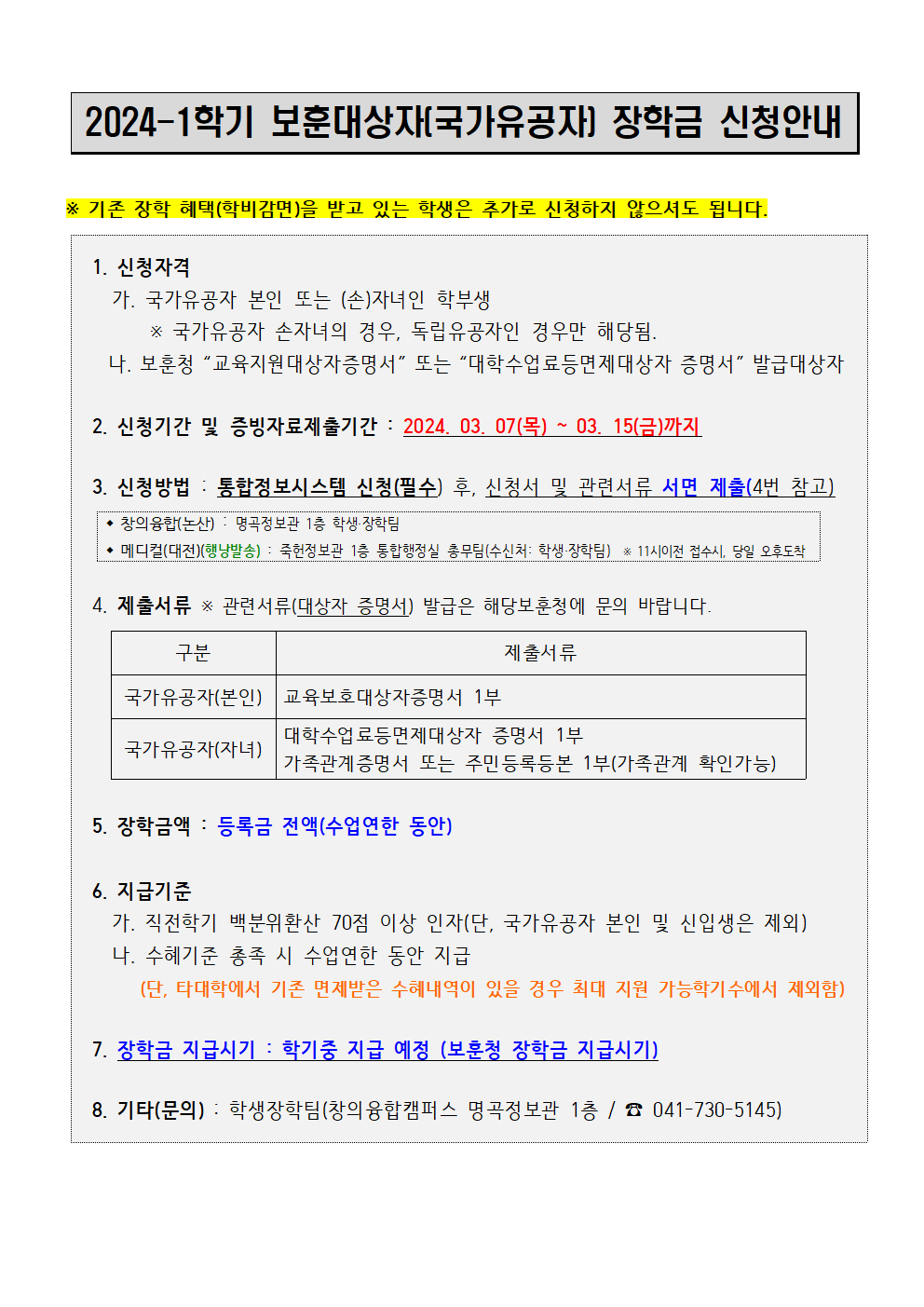 | 제목 | 2024학년도 1학기 보훈대상자(국가유공자) 장학금 신청 안내 | ||||