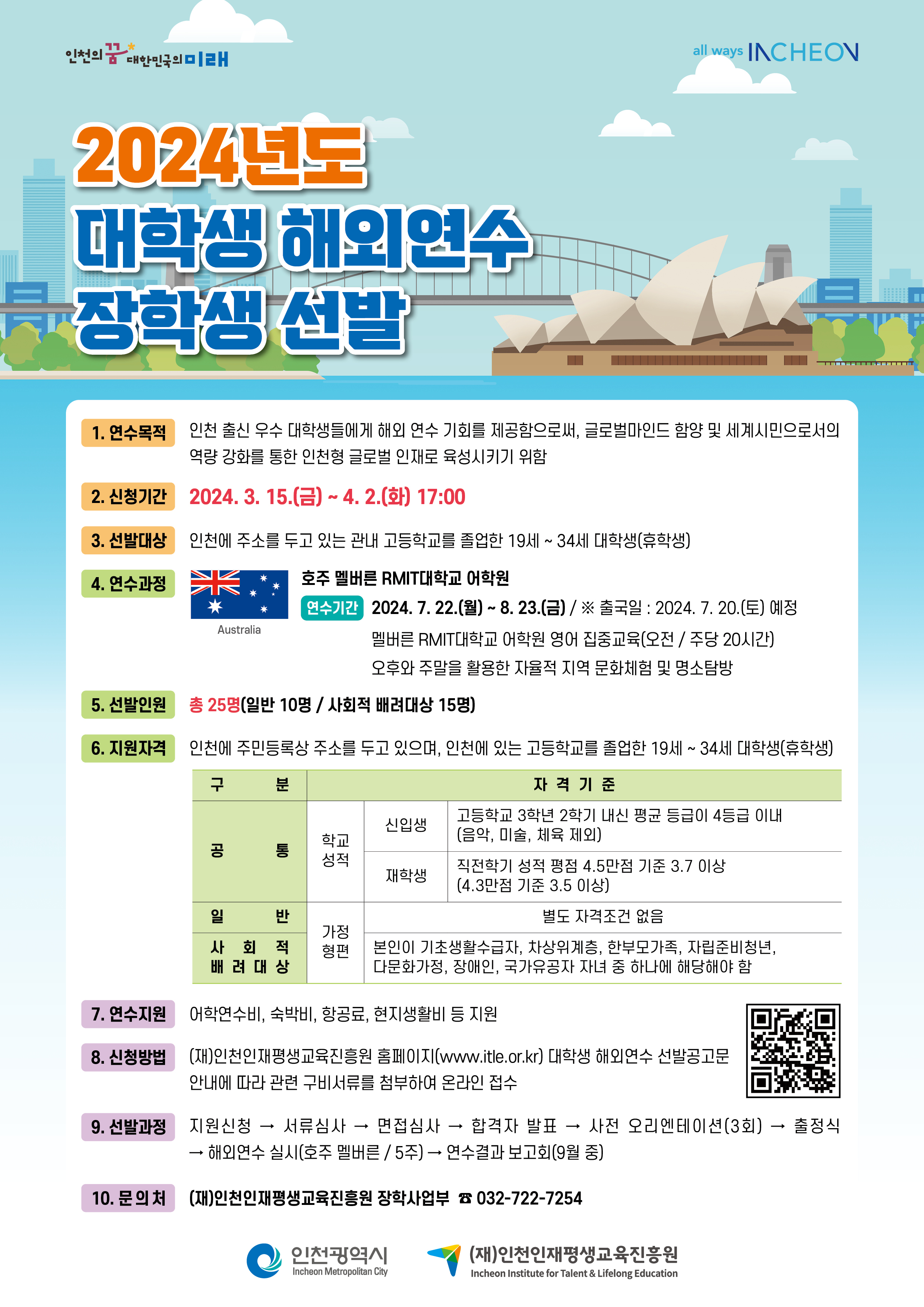 | 제목 | 2024년도 인천광역시 대학생 해외연수 장학생 선발 | ||||