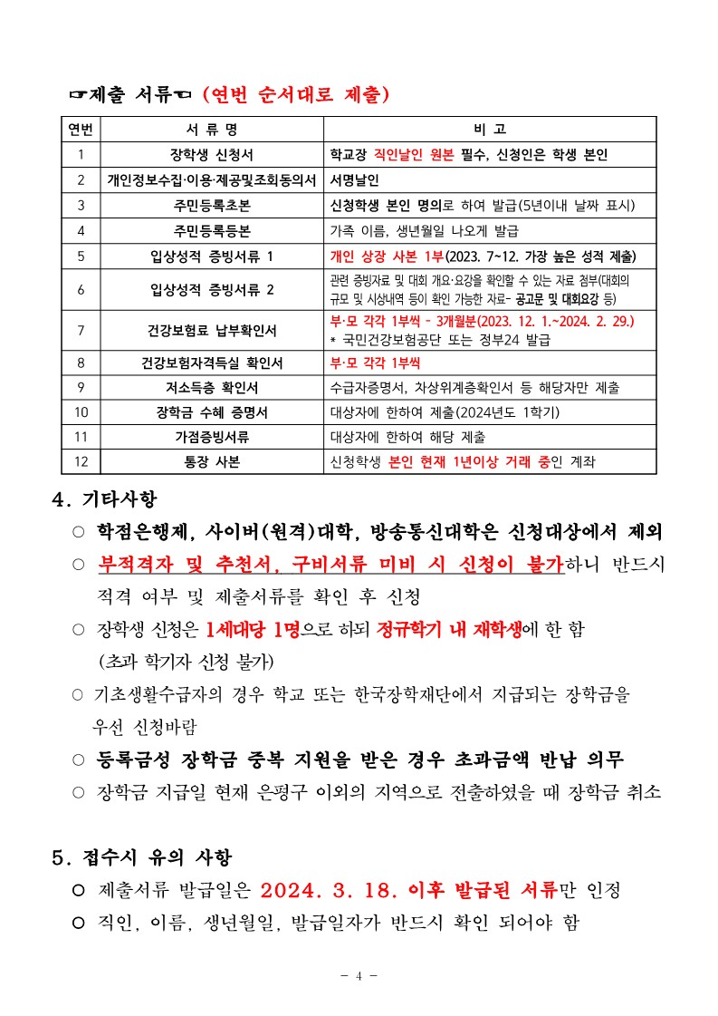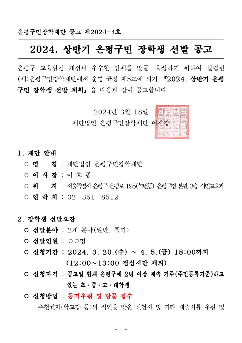 | 제목 | 2024년 상반기 은평구민장학생 선발 공고 | ||||