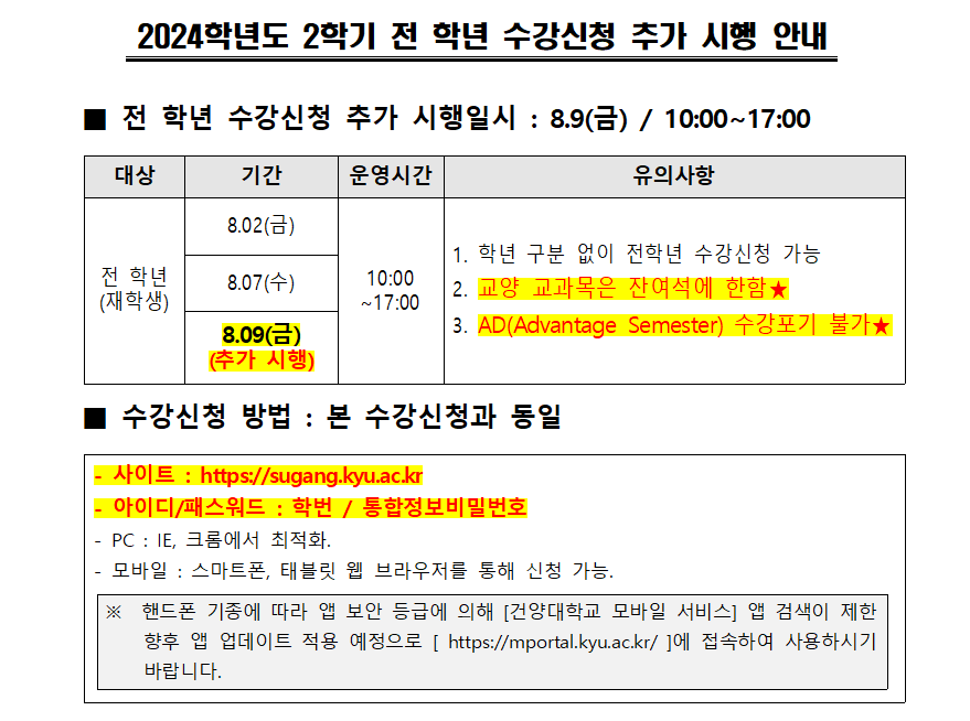 | 제목 | [수강신청] 2024-2학기 전 학년 수강신청 추가 시행 안내 | ||||