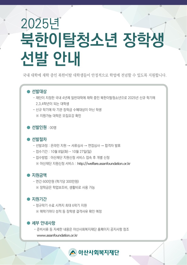 | 제목 | 2025년 북한이탈청소년 장학생 선발 안내 | ||||