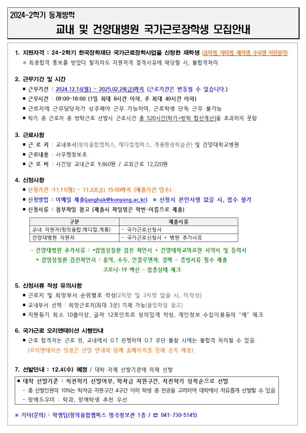 | 제목 | 2024-2학기 동계방학 교내 및 건양대병원 국가근로장학생 모집 안내 | ||||