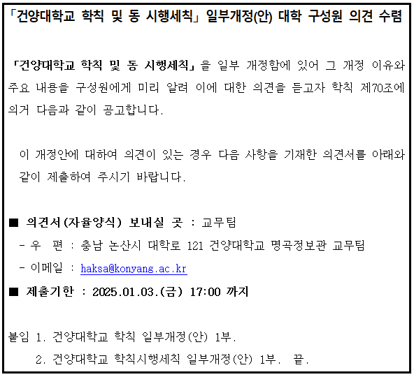 | 제목 | 「건양대학교 학칙 및 동 시행세칙」 일부개정(안) 대학 구성원 의견 수렴 | ||||
