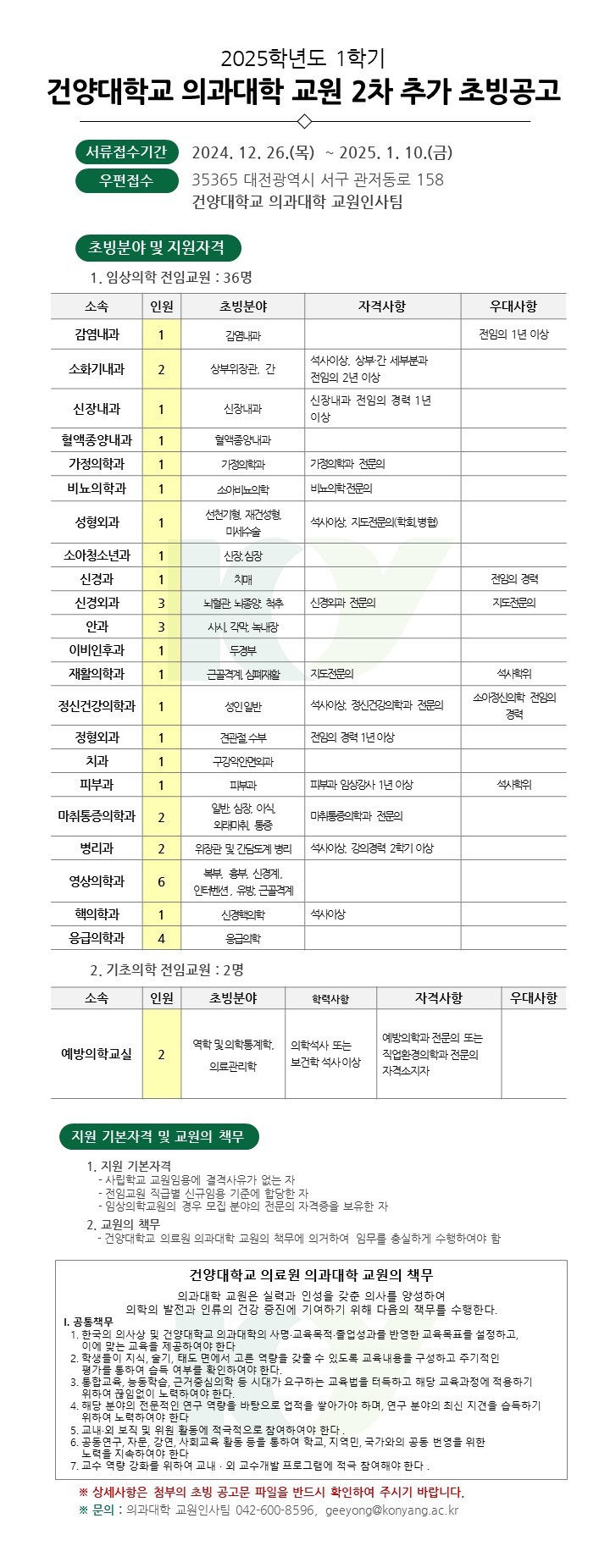 | 제목 | 2025학년도 1학기 건양대학교 의과대학 교원 2차 추가 초빙공고 | ||||