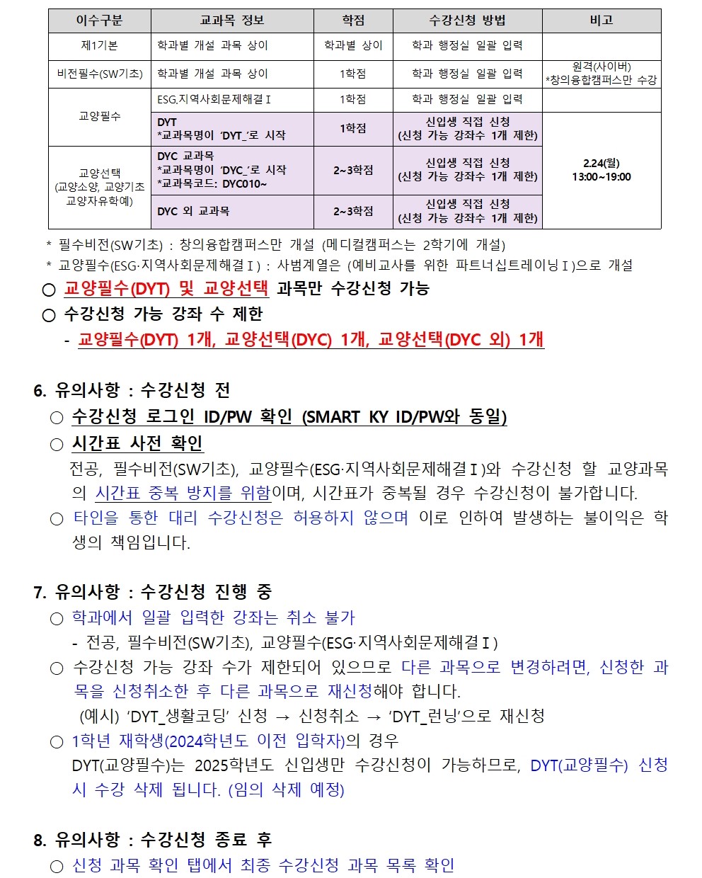 | 제목 | [업데이트 내용 필히 확인] 2025학년도 신입생 수강신청 안내(1학년 재학생 추가 신청 가능) | ||||