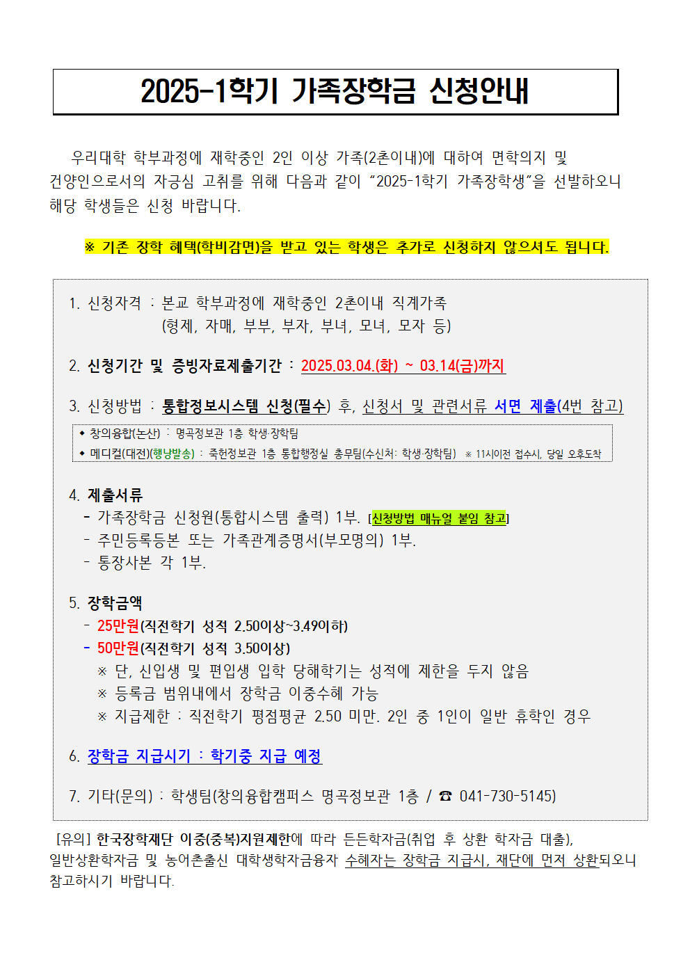 | 제목 | 2025-1학기 가족장학금 신청안내 | ||||