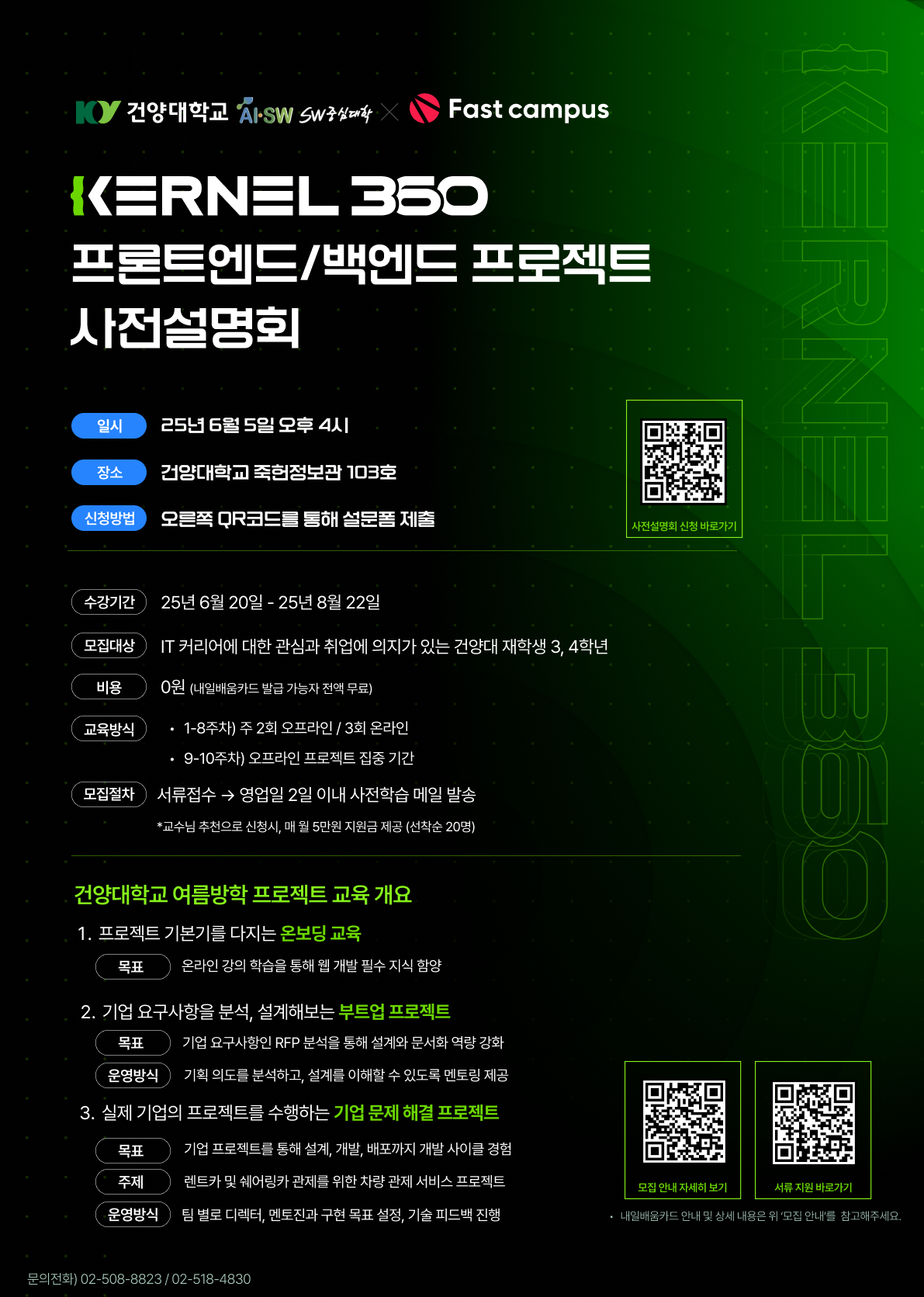| 제목 | KERNEL 360 프론트엔드/백엔드 프로젝트 사전설명회 안내 | ||||