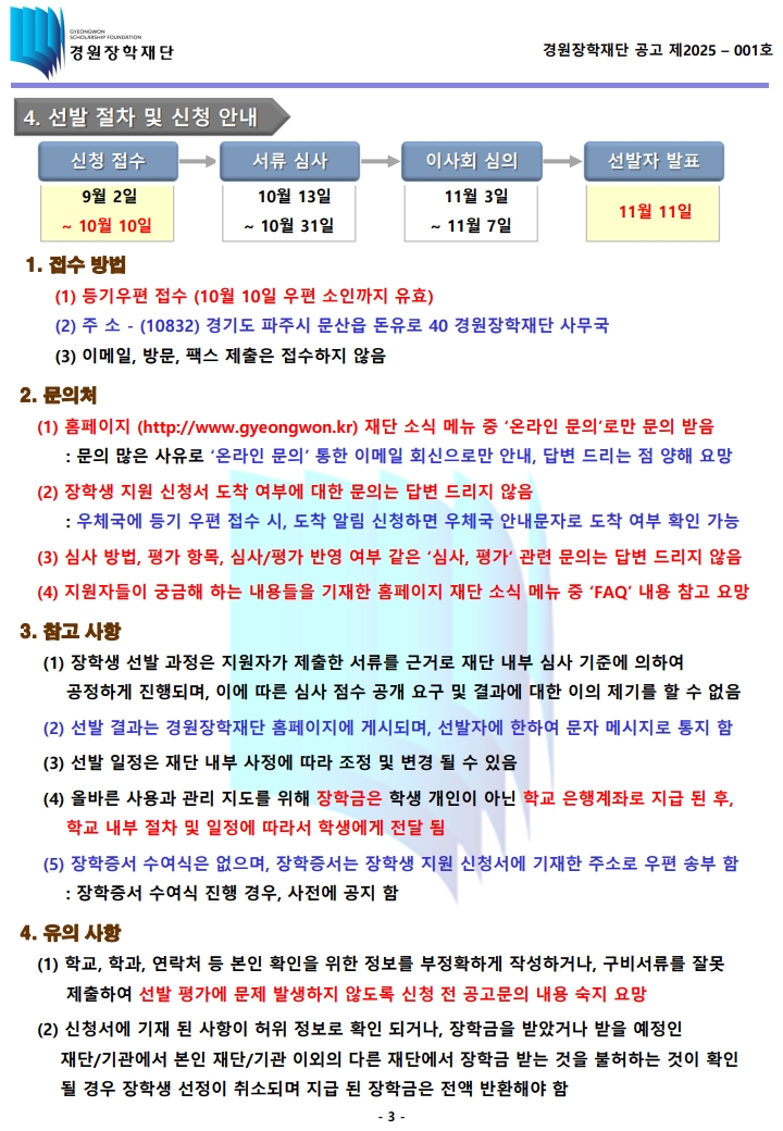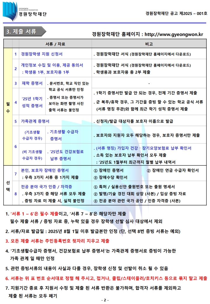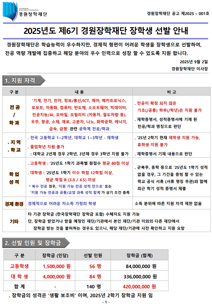 | 제목 | 2025년도 제6기 경원장학재단 장학생 선발안내 | ||||