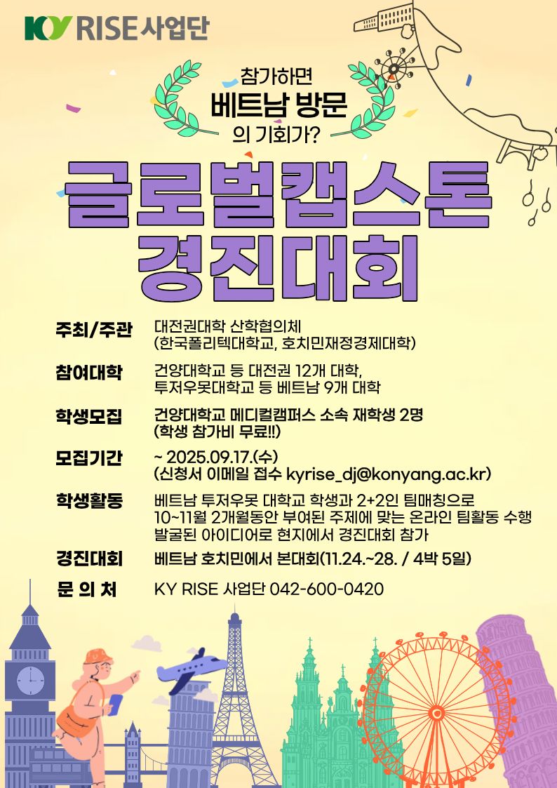 | 제목 | [메디컬RISE사업] 대전-호치민 글로벌 캡스톤디자인 경진대회 참가학생 모집 | ||||