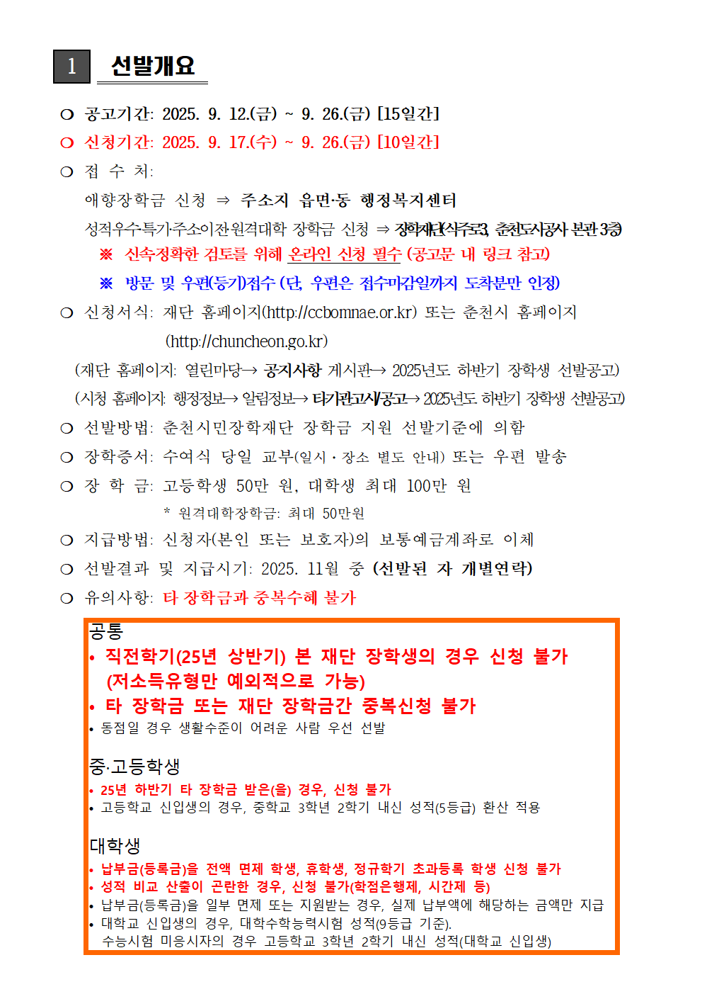 | 제목 | [춘천시민장학재단] 2025년도 하반기 봄내장학생 선발안내 | ||||