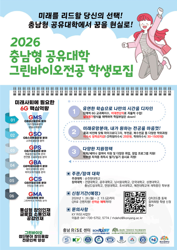 충청남도 지역혁신중심 대학지원체계(RISE) 사업의 일환으로 운영되는 충남 RISE 공유대학에서 2026학년도 그린바이오융합전공 참여 학생을 아래와 같이 모집하오니, 관심 있는 학생들의 많은 참여 바랍니다. ▶ 전공명: 그린바이오융합전공 ▶ 지원대상: 건양대학교 글로컬캠퍼스 재학생 ▶ 신청기간: 1. 26.(월) ~ 2. 13.(금) 예정 ※ 포스터 QR코드를 통해 참여 희망 신청 접수 ▶ 수강신청기간: 2. 2.(월) 10:00 ~ 13.(금) 17:00 ▶ 참여혜택 1) 참여학생 3학점 이수시 25 만원 2) 복수전공 학위 이수시 30 ~ 150 만원 ▶ 원서접수처 : 충남 RISE 공유대학 홈페이지 https://www.crsu.ac.kr/ ※ 홈페이지 가입 필수 ▶ 모집문의처: 건양대학교 충남 RISE사업단(041-730-5752, 5774, rhdehd@konyang.ac.kr ※ 추후 QR코드를 통해 접수된 이메일 혹은 연락처로 안내 예정 ※ 그린바이오융합전공 관련 참고: https://zrr.kr/p6zco5 |
