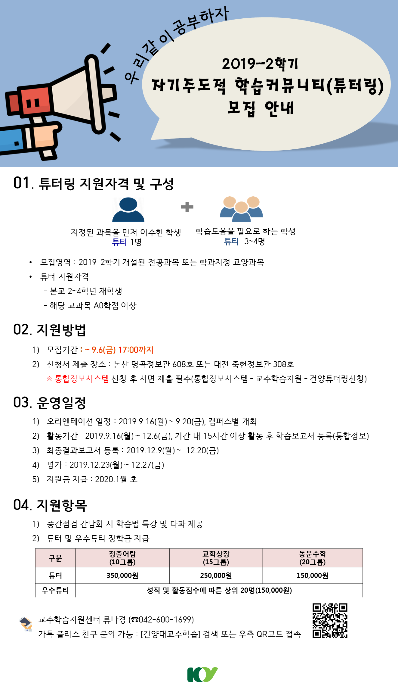 | 제목 | 2019-2학기 자기주도적 학습커뮤니티(튜터링) 모집 안내 | ||||