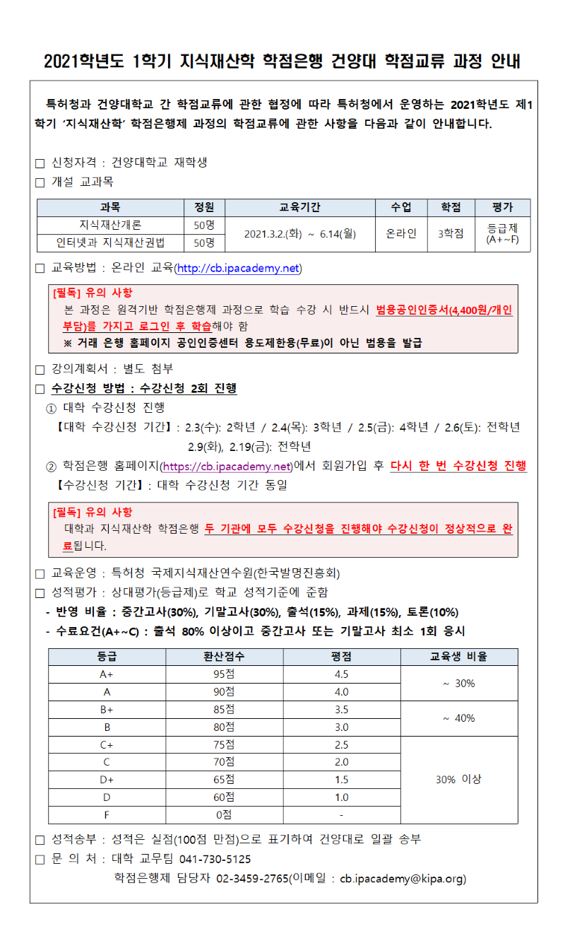| 제목 | [학점교류] 2021학년도 1학기 지식재산학 학점교류 과정 안내 | ||||