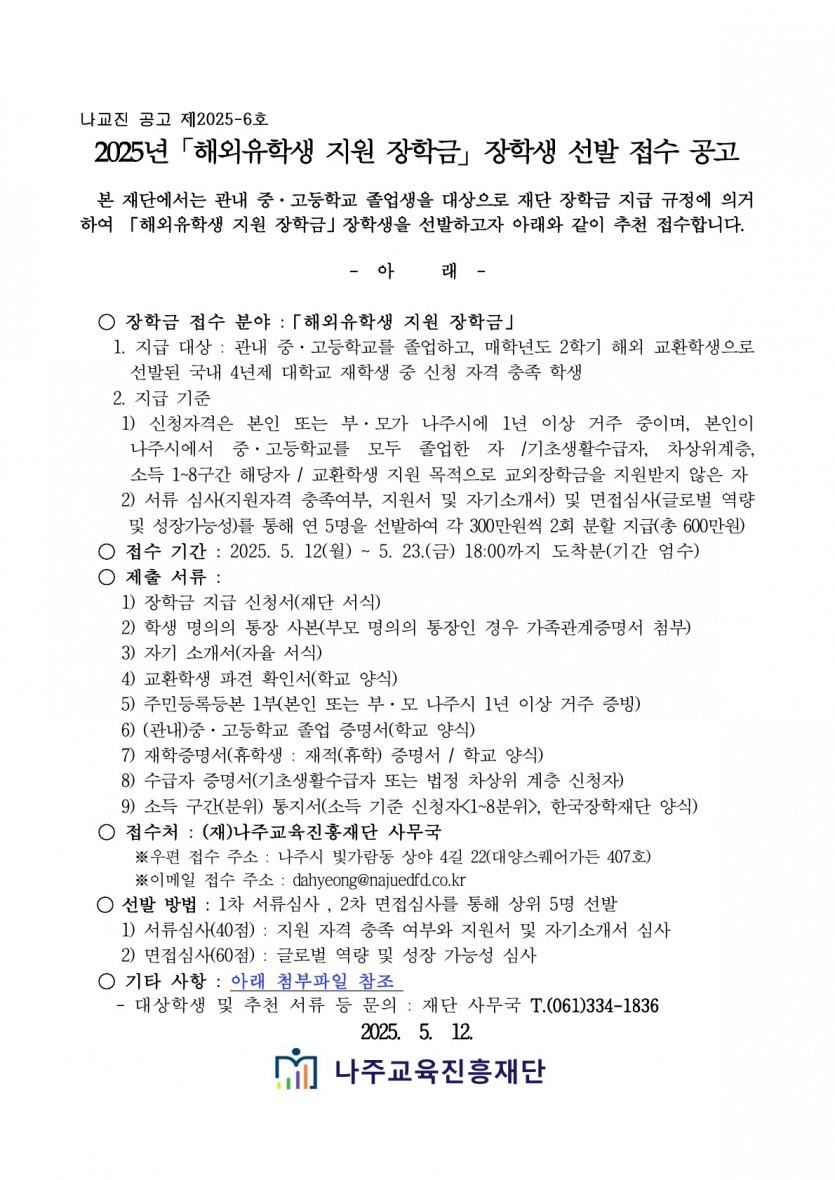 | 제목 | [나주교육진흥재단] 2025년 해외 유학생 지원 장학금 선발 공고 | ||||