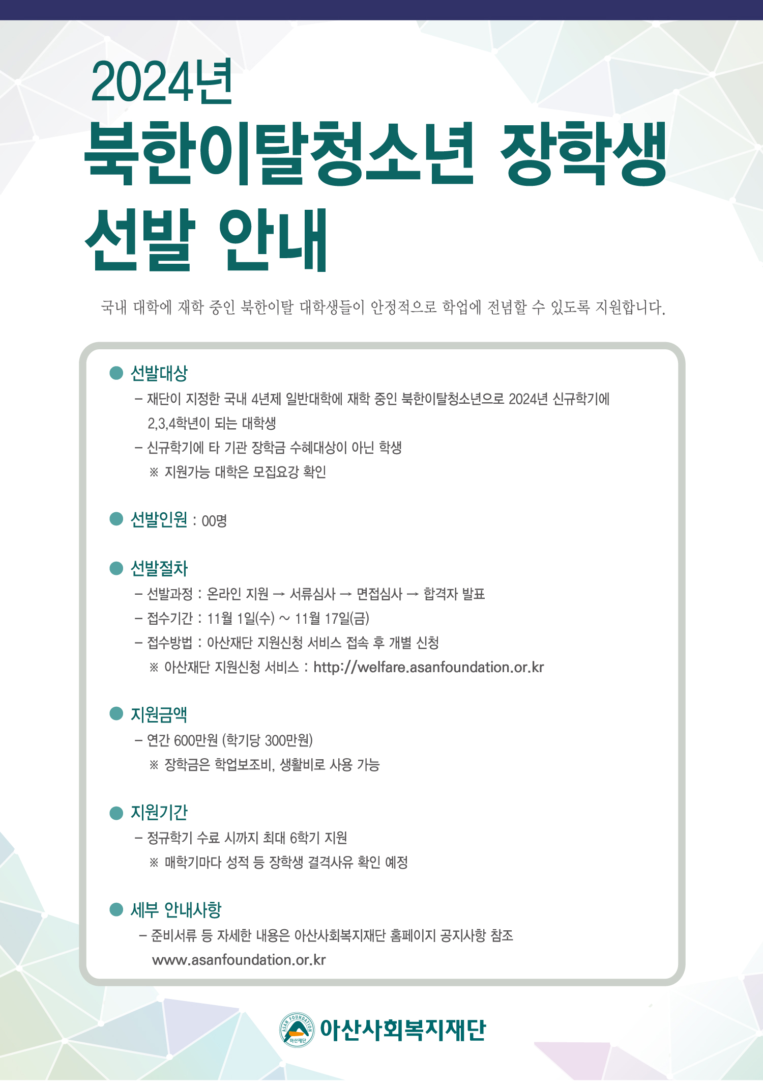 | 제목 | 2024년 아산사회복지재단 북한이탈청소년장학생 모집안내 | ||||