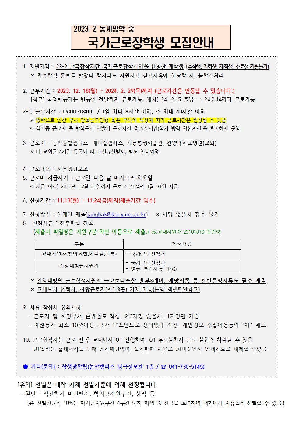 제목 ★11.13~11.24까지★ 23년 동계방학중 국가근로장학생 모집안내(교내,건양대병원)