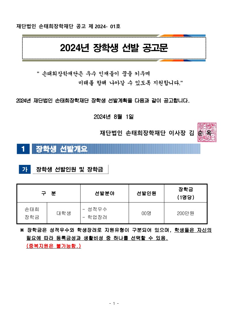 | 제목 | 2024년 재단법인 손태희장학재단 장학생 선발 안내 | ||||