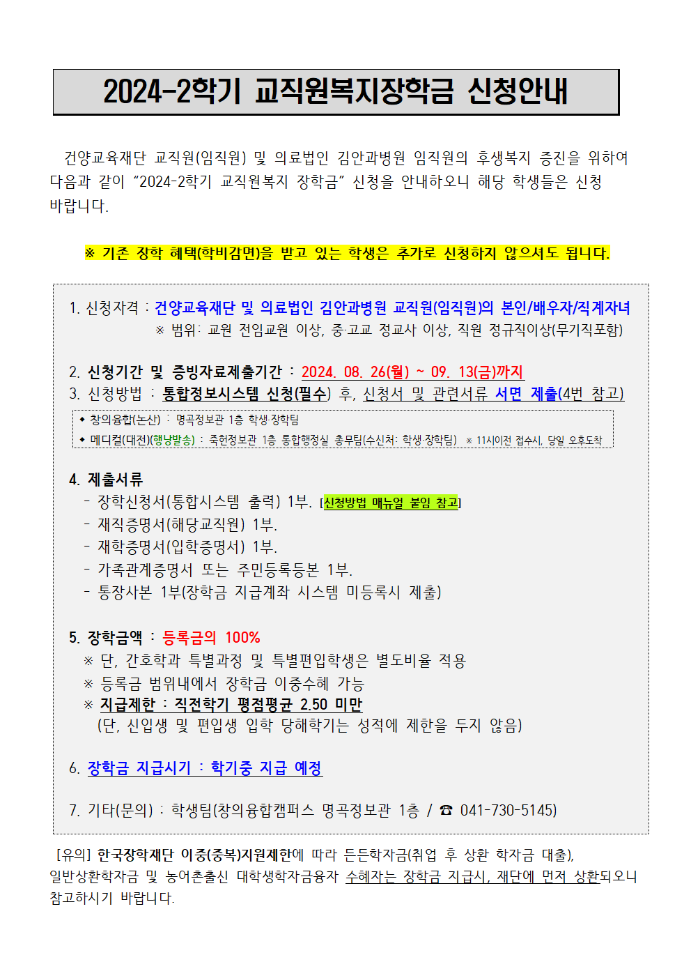 | 제목 | 2024-2학기 교직원복지장학금 신청안내(신규자) | ||||