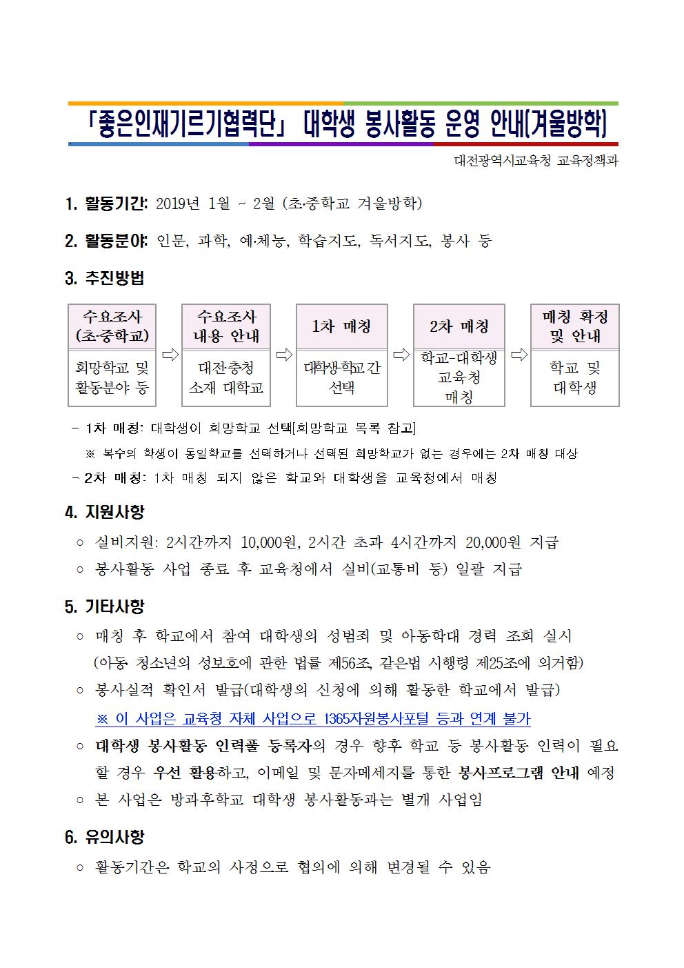 | 제목 | 대전시 교육청 겨울방학 기간 좋은인재 기르기 협력단 희망자 신청 안내 | ||||