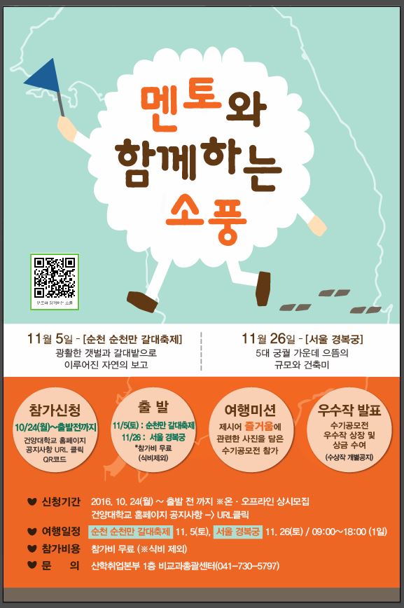 2016-2학기 멘토와 함께하는 소풍[笑風] 프로그램 참가자 모집을 진행하고 있으니 재학생 여러분들의 많은 관심과 신청 바랍니다.