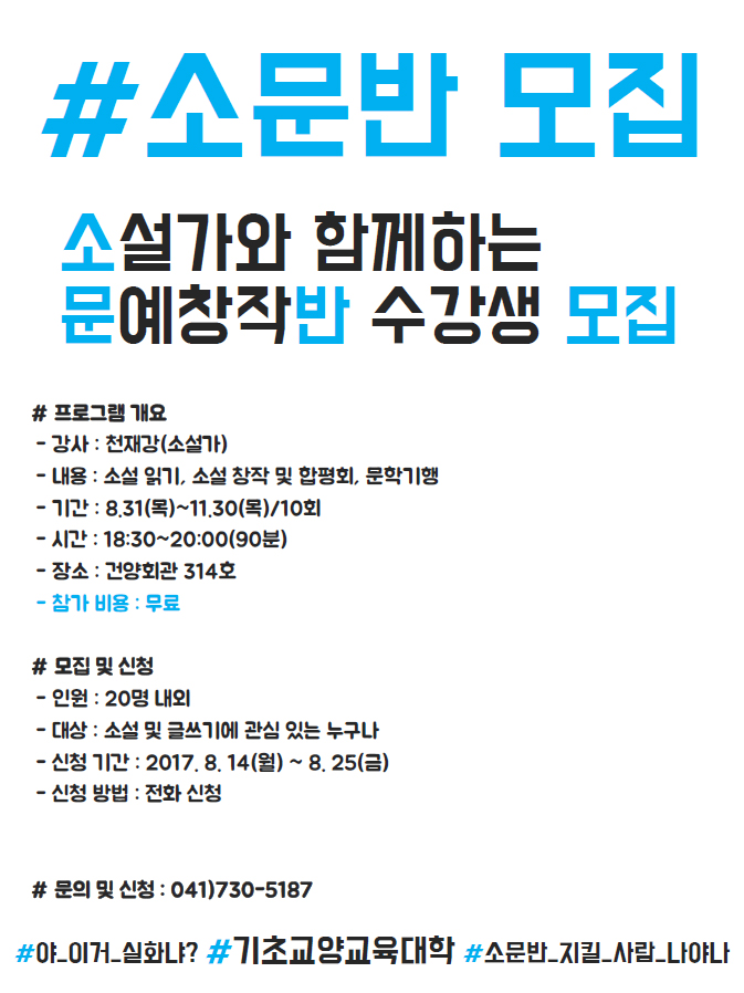 | 제목 | 소설가와 함께하는 문예창작반 수강생 모집 | ||||