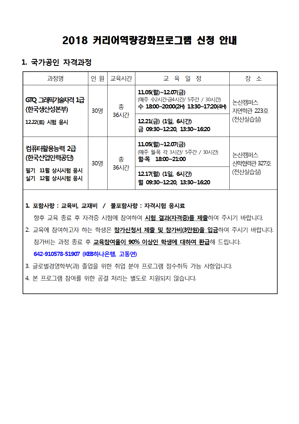 국가공인자격 2개, 민간자격 2개, 취준생을 위한 특강 등 총 5개 과정을 운영하오니 관심있는 학생 여러분의 많은 참여 바랍니다.
