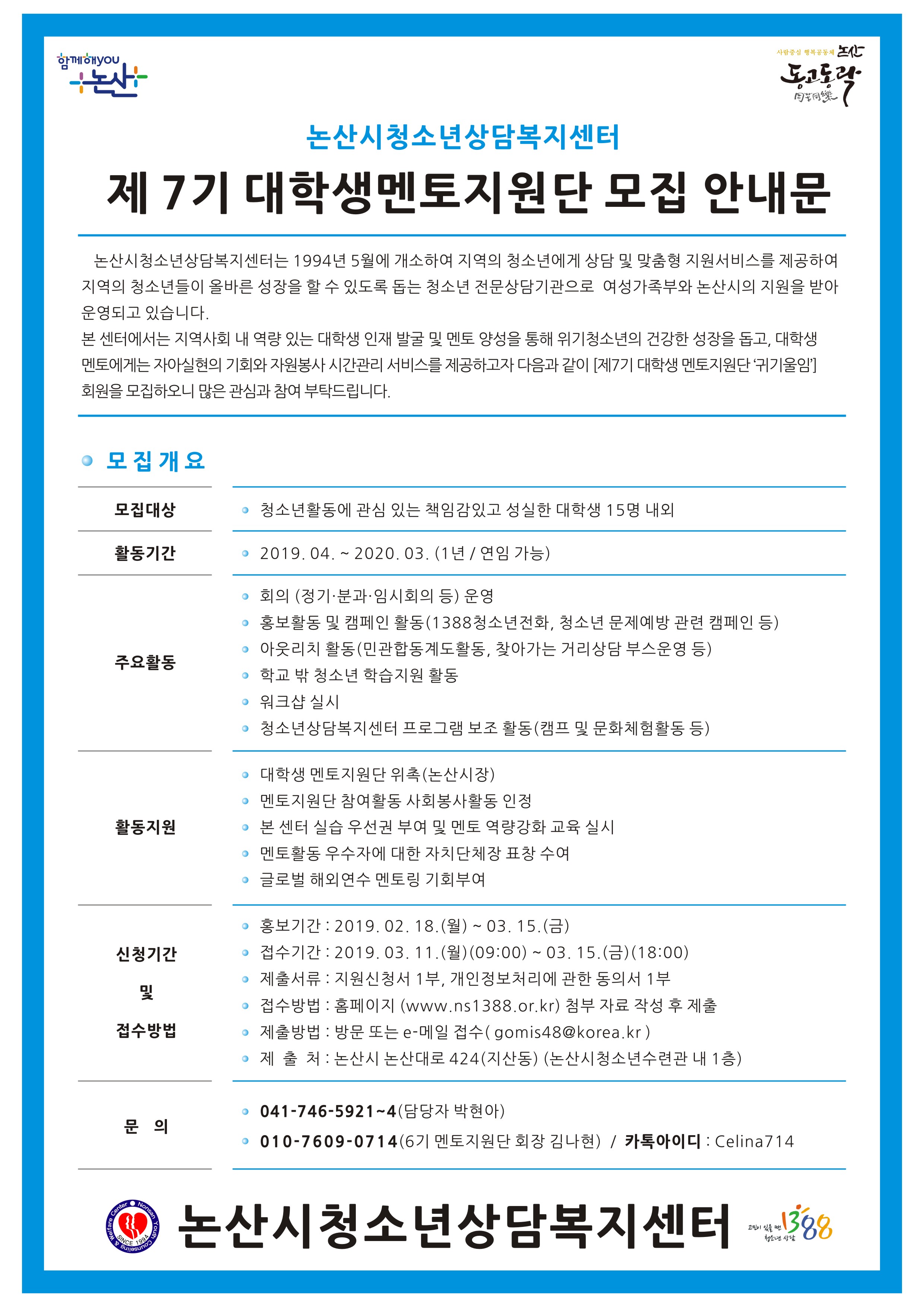 | 제목 | 논산시청소년상담복지센터 제7기 대학생 멘토지원단원 모집 안내 | ||||