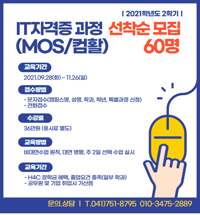 | 제목 | 2021학년도 비교과 IT 자격과정(MOS, 컴활) 안내 | ||||