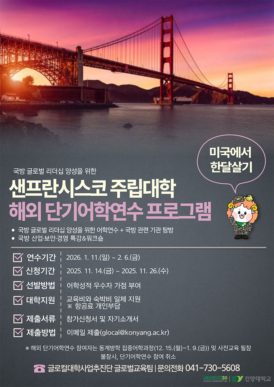 | 제목 | 2025학년도 샌프란시스코 주립대학 해외 단기어학연수 프로그램 참가자 모집 | ||||