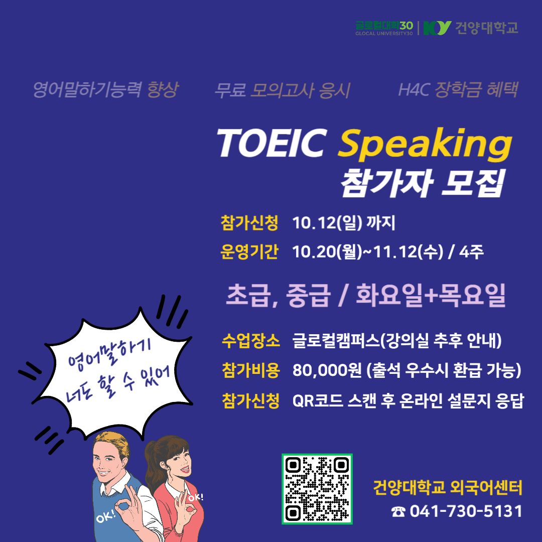 제목 | TOEIC Speaking 프로그램 참가자 모집(10.20(월) 시작, 10.12(일) 까지 모집) | ||||