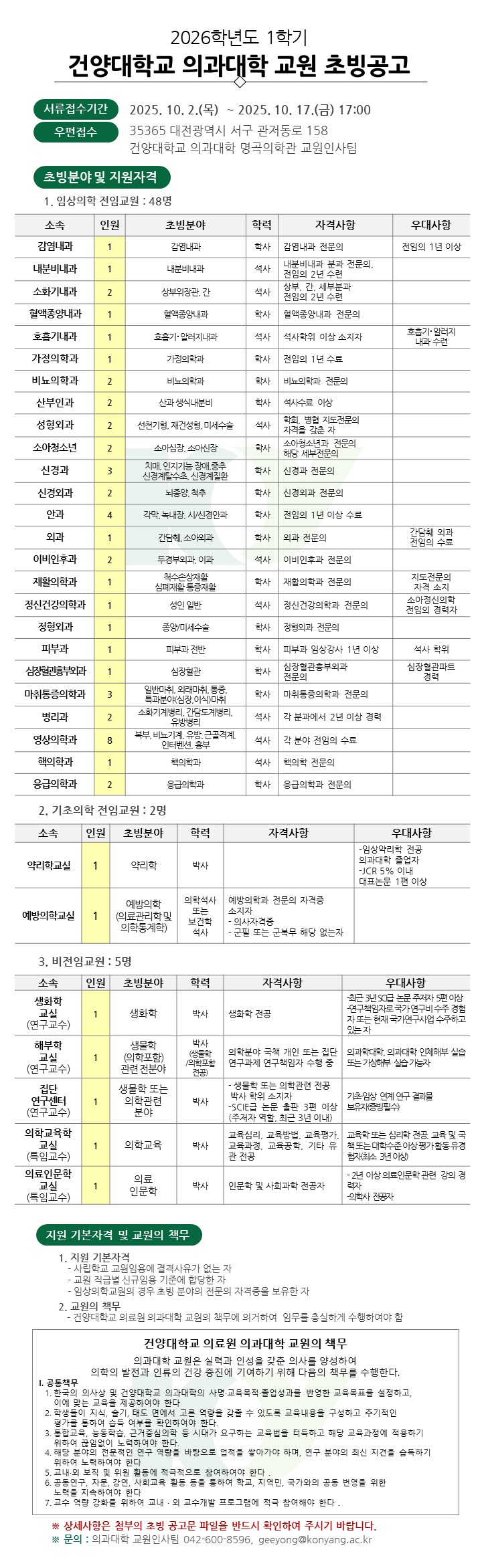 제목 | 2026학년도 1학기 건양대학교 의과대학 교원 초빙공고 | ||||