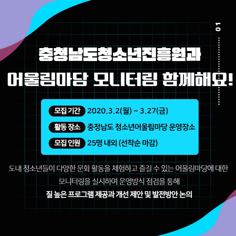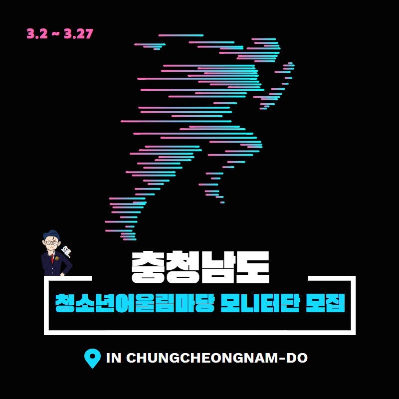 | 제목 | 2020 충청남도 청소년어울림마당 모니터단 모집 안내 | ||||