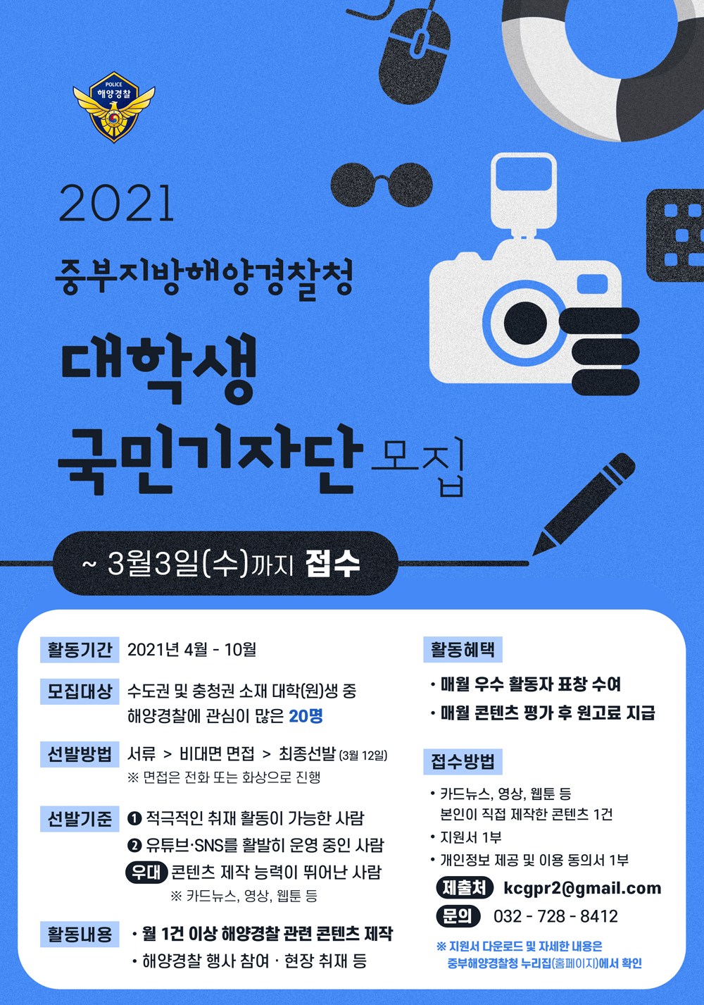 | 제목 | 중부지방해양경찰청 대학생 국민기자단 모집 안내 | ||||