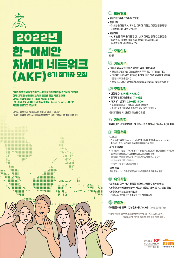 | 제목 | 2022년 한-아세안 차세대 네트워크(AKF) 6기 참가자 모집 안내 | ||||