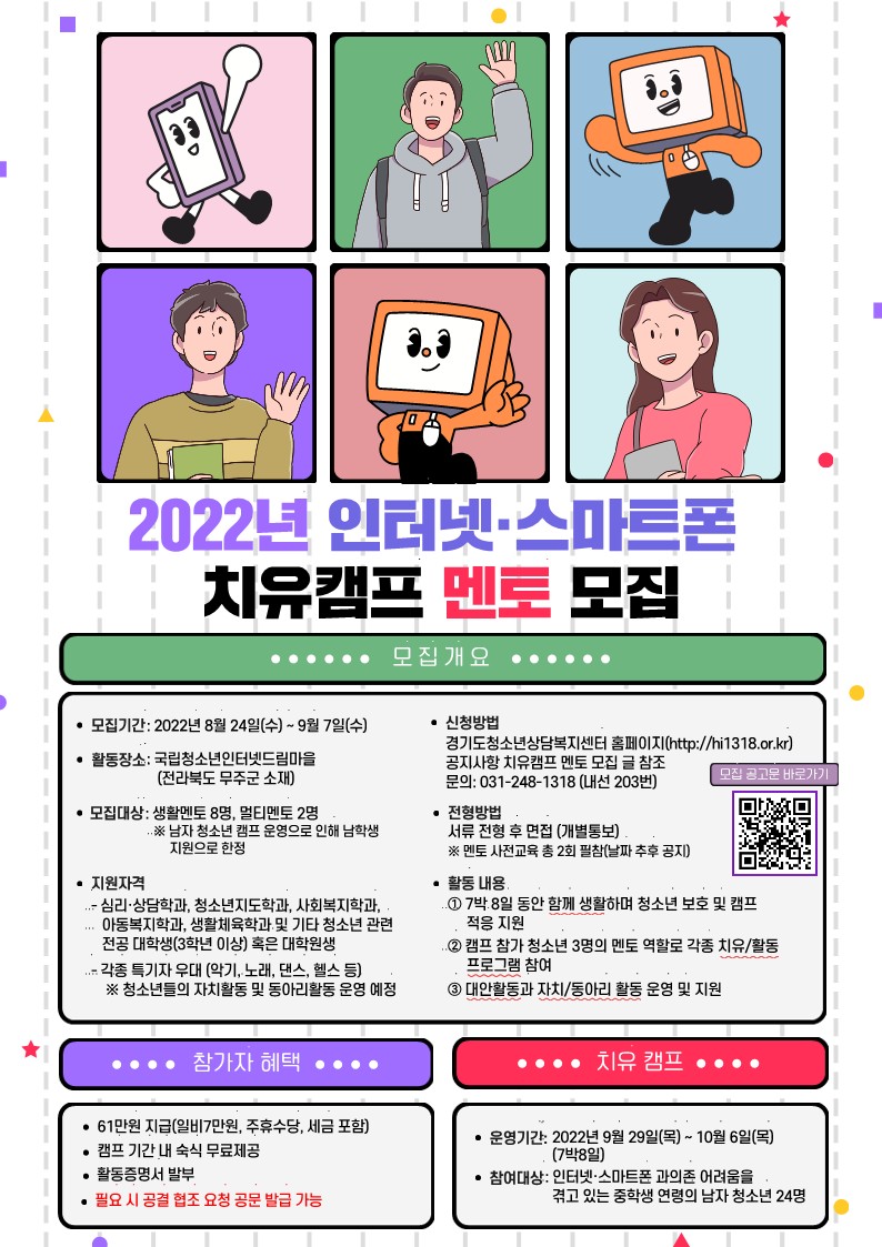 | 제목 | 2022년 인터넷·스마트폰 치유캠프 멘토 추가 모집 | ||||