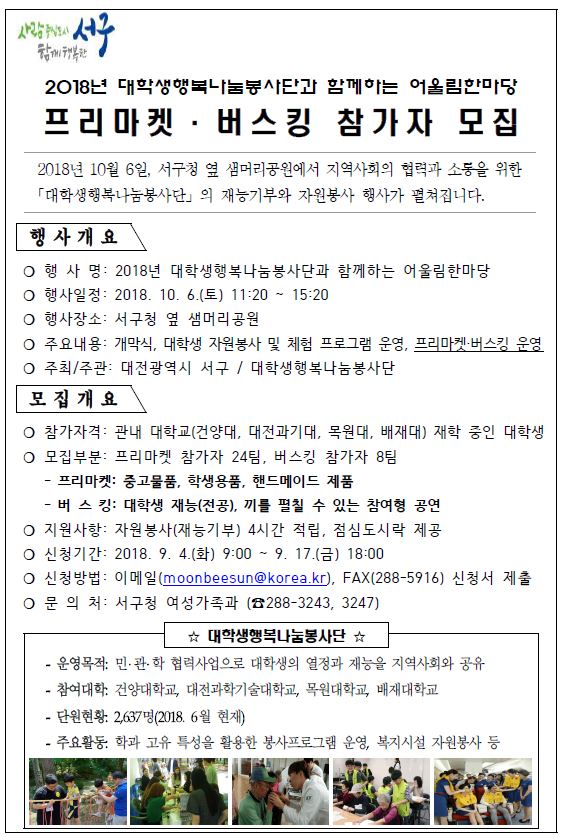 | 제목 | 2018년 대학생행복나눔봉사단과 함께하는 어울림한마당 프리마켓,버스킹 참가자 모집 | ||||