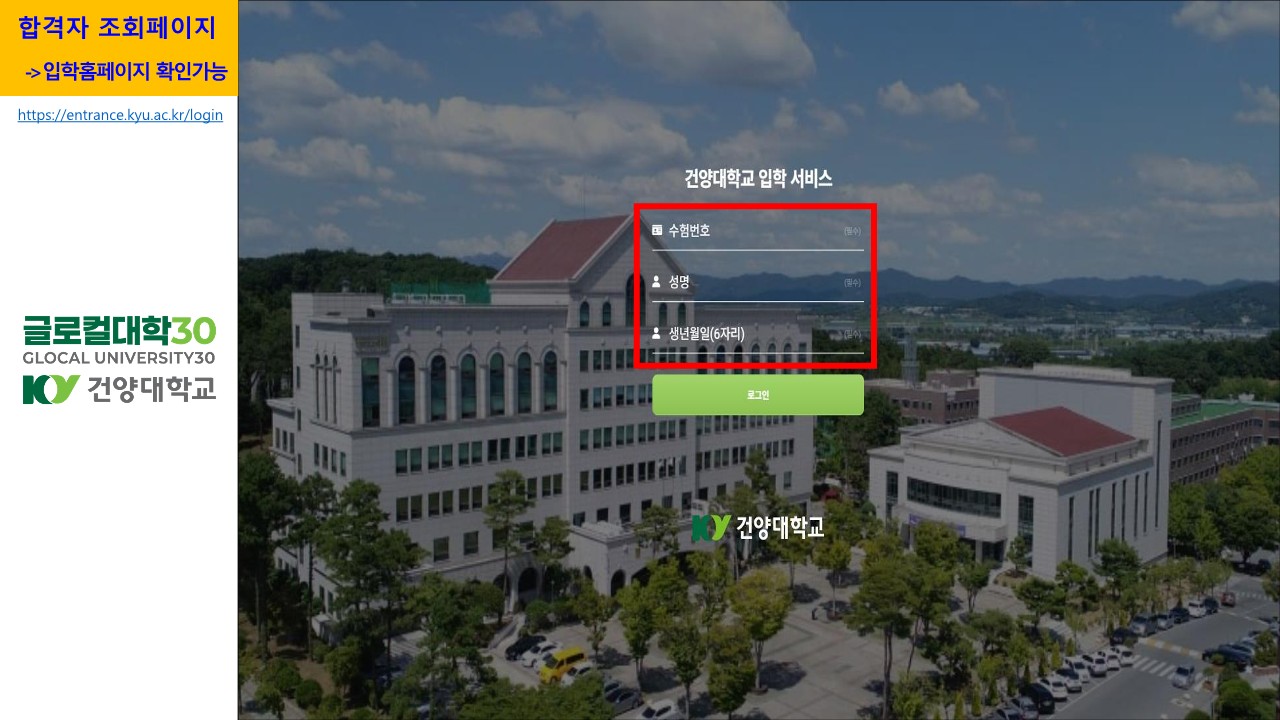 ※ 수시 '합격자 조회 페이지' : https://entrance.kyu.ac.kr/login - 최초합격자 등록기간 : 12.15(월)~17(수) 24:00 - 추가합격자 통보 및 등록기간 : 12.18(목) 09:00~24(수) 16:00 ※ 통보마감은 12.23(화) 18:00까지, 12.24(수)은 등록만 가능