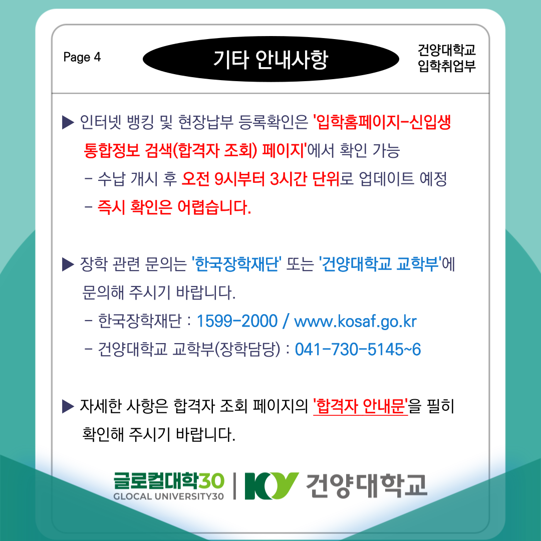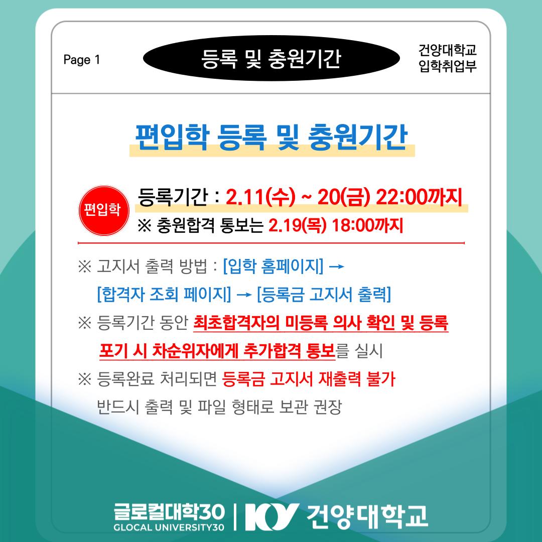 ※ 합격자 조회 페이지 링크 : https://entrance.kyu.ac.kr/login → 합격자는 '등록금 고지서' 확인 가능 → 등록(납부) 및 충원은 2.11(수)부터 가능 → 합격자의 미등록 의사 확인 및 등록 포기 시 차순위자에게 추가합격 통보 실시 → 자세한 내용은 합격자 안내문 필히 확인