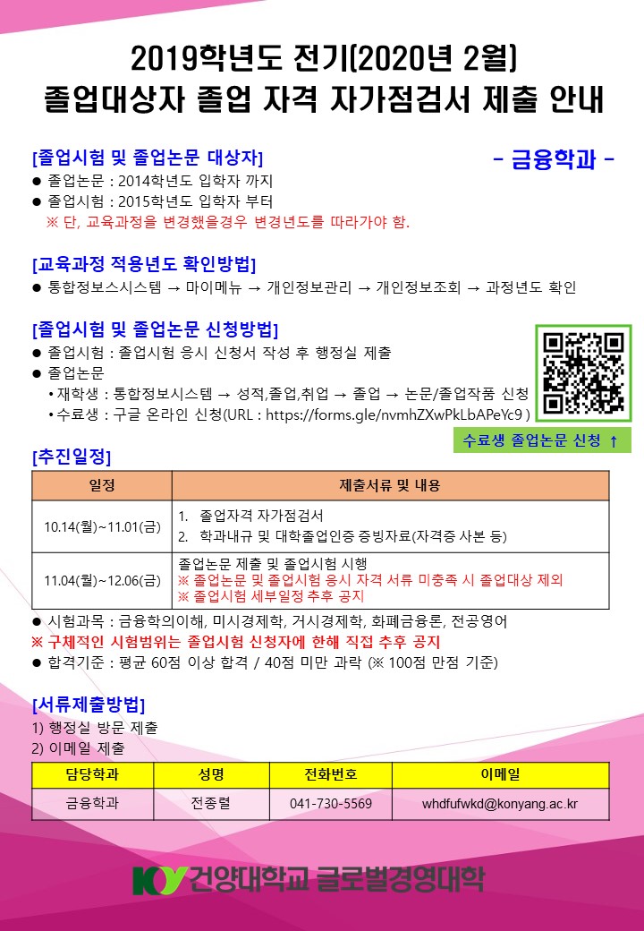 제출기한 : ~11.1(금) 까지 졸업시험(논문) 면제자는 자가점검서만 제출 해 주시기 바랍니다. 1학기에 제출해주신 학생들께서도 제출 부탁드립니다. |