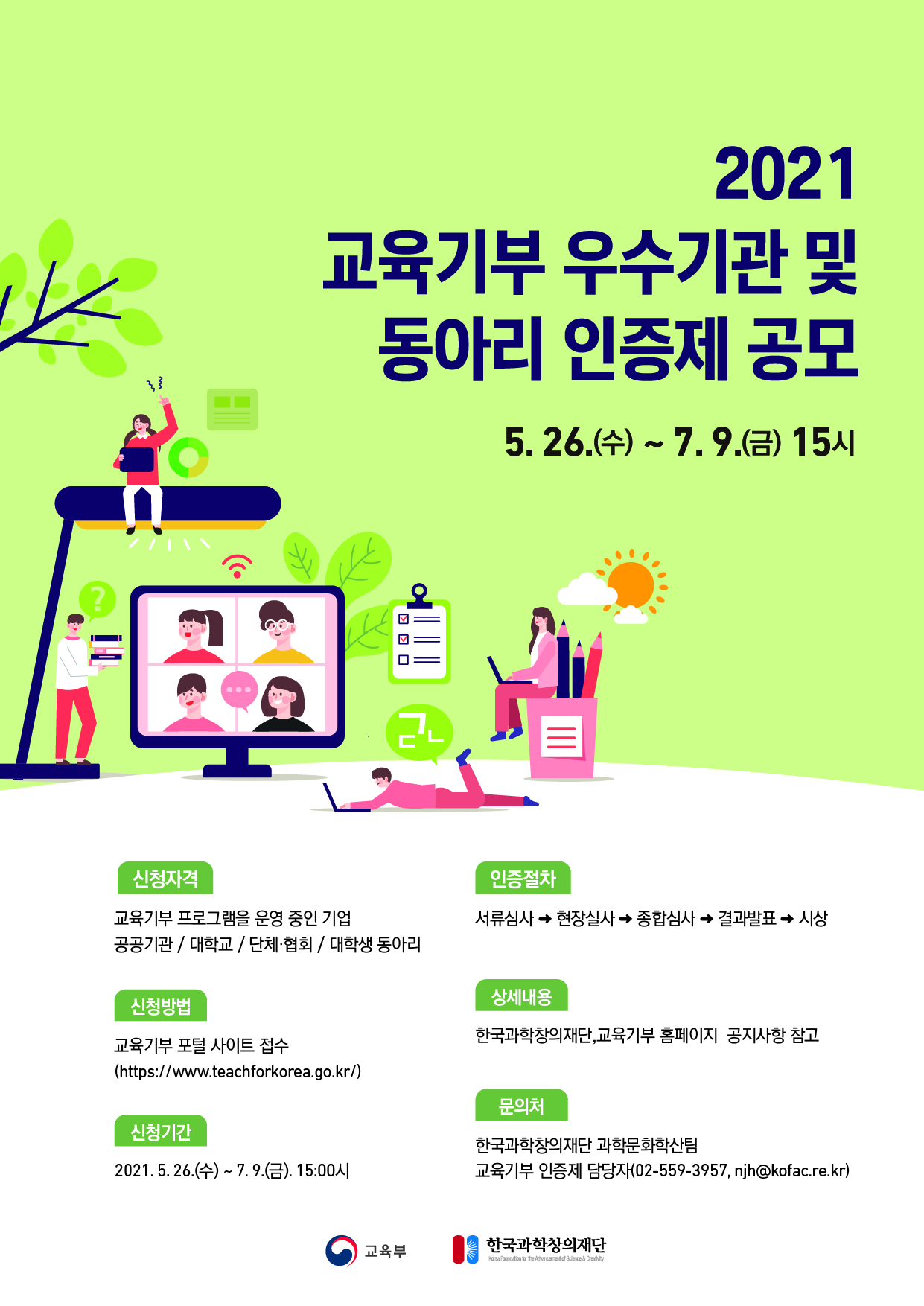 | 제목 | 2021년 교육기부 우수기관 및 동아리 인증제 모집 안내 | ||||