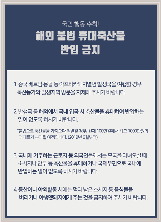 | 제목 | 아프리카돼지열병 예방 국민 행동수칙 안내 | ||||