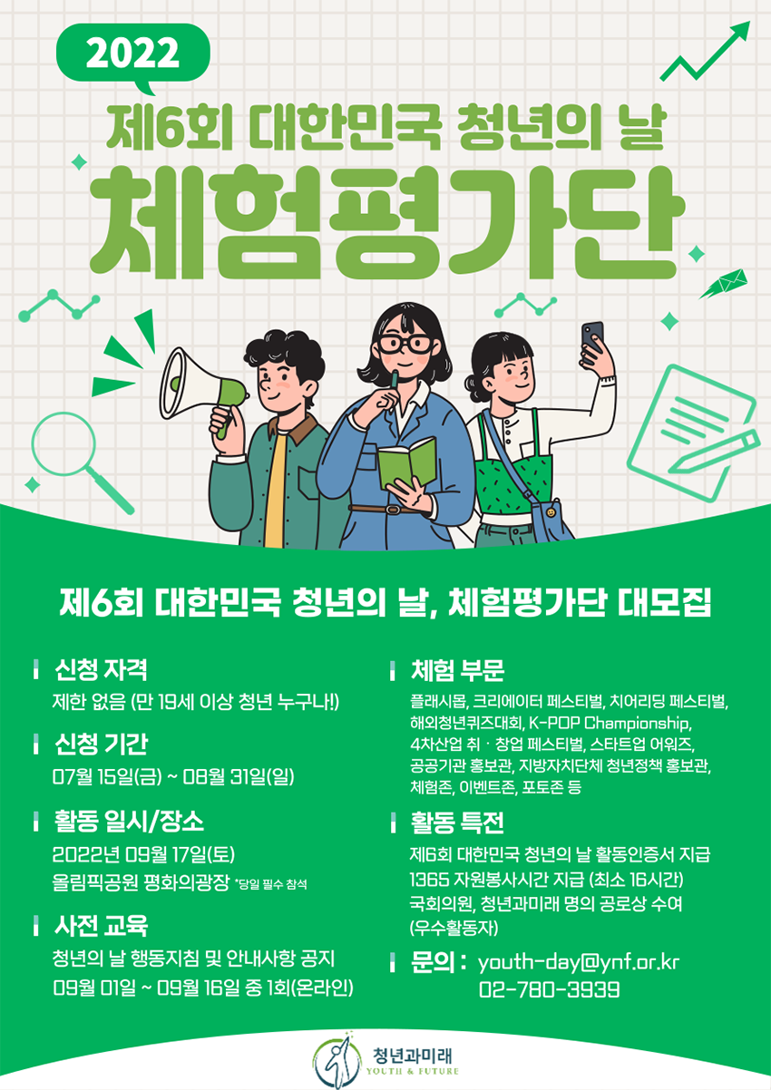 2022 제6회 대한민국 청년의 날 체험평가단 모집 화이팅 넘치는 청년이라면 주목? 대한민국 청년들이 직접 기획하고 참여하는 참여형 종합축제✨ 이번 청년의 날을 평가해주실 체험평가단 여러분을 모집합니다! ✔️ 신청 자격: 제한 없음 (만 19세 이상 청년 누구나) ✔신청 기간: 07월 15일 (금) ~ 08월 31일 (일) ✔신청링크: https://forms.gle/qERceHZrjgxzYuty8 ✔활동 일시/장소 - 2022년 09월 17일 (토) - 올림픽공원 평화의광장 * 당일 필수 참석 ✔사전 교육 - 청년의 날 행동지침 및 안내사항 공지 - 09월 01일 ~ 09월 16일 중 1회 (온라인) ✔체험 부문 - 플래시몹, 크리에이터 페스티벌, 치어리딩 페스티벌, 해외청년퀴즈대회, K-POP Championship, 4차산업 취•창업 페스티벌, 스타트업 어워즈, 공공기관 홍보관, 지방자치단체 청년정책 홍보관, 체험존, 이벤트존, 포토존 등 ✔활동 특전 - 제6회 대한민국 청년의 날 활동인증서 지급 - 1365 자원봉사시간 지급 (최소 16시간) - 국회의원, 청년과미래 명의 공로상 수여 (우수활동자) ✔문의 - youth-day@ynf.or.kr - 02-780-3939 제6회 청년의 날 체험평가단 모집에 많은 관심 바랍니다