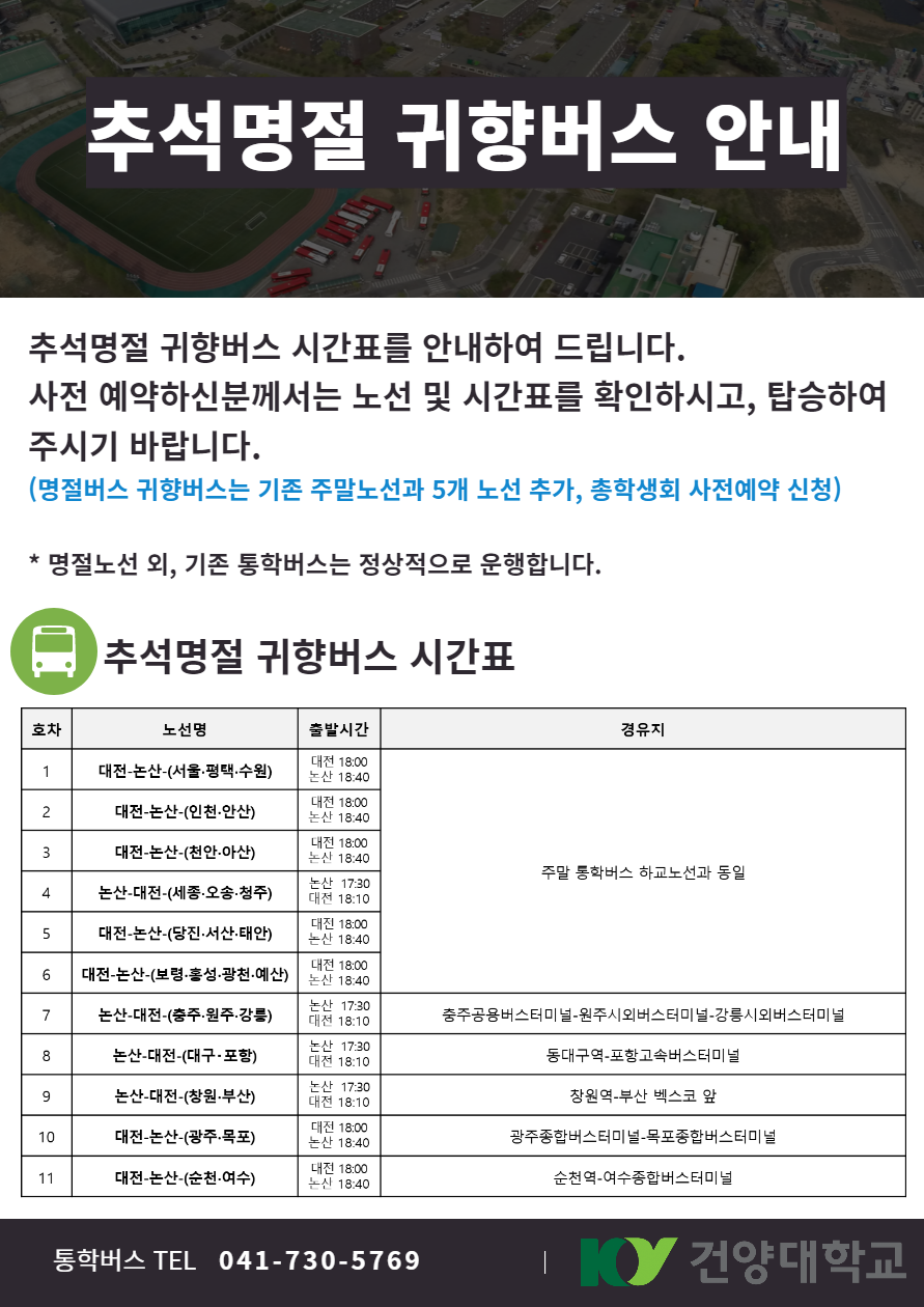 | 제목 | 2022학년도 추석명절 귀향버스 운행안내 | ||||