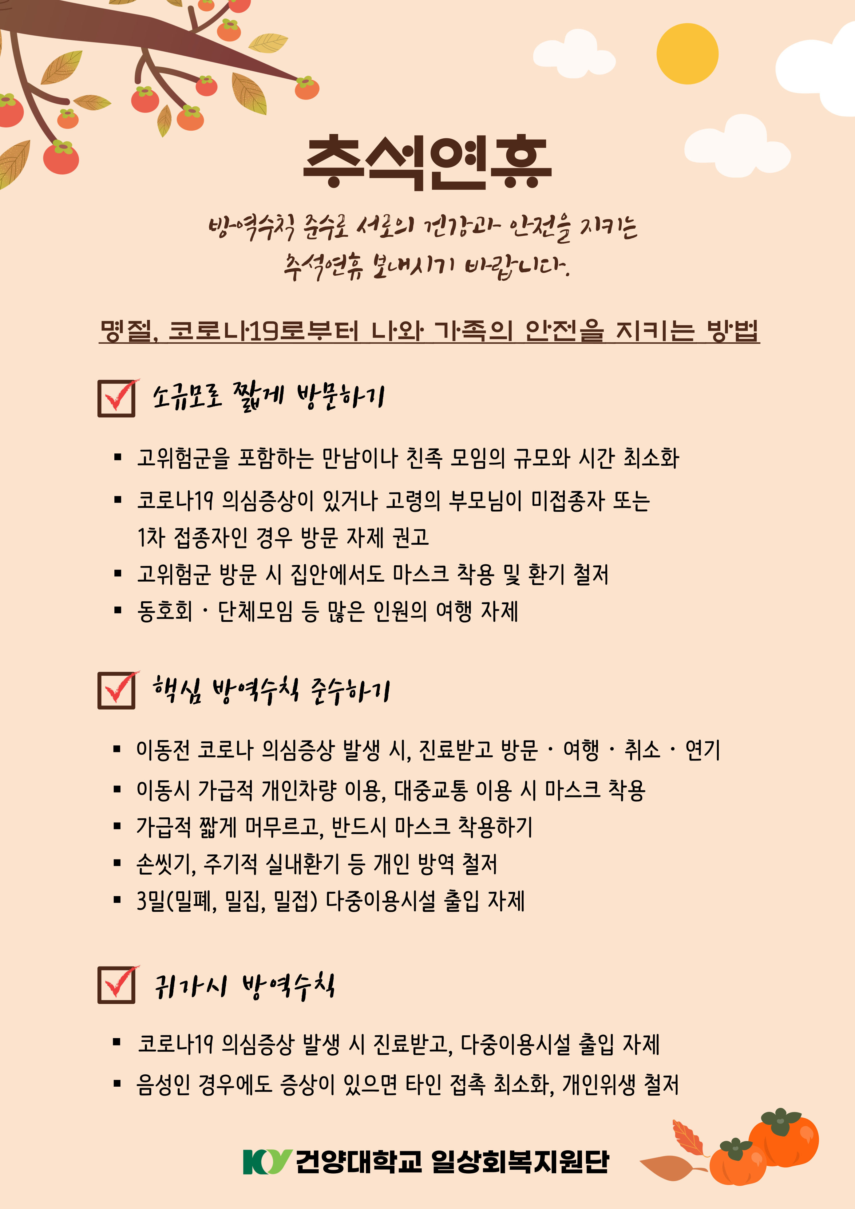 | 제목 | [대학일상회복지원단] 추석 연휴 방역수칙 준수 안내 | ||||